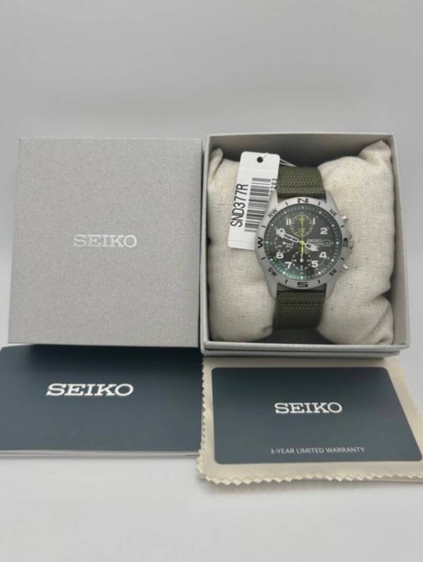 Découvrez les montres Seiko SND379P2 (cadran bleu) et Seiko SND377P2 (cadran vert militaire), deux chronographes emblématiques alliant précision japonaise, design intemporel et robustesse.